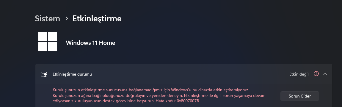 Merhaba. Windows'u etkinleştirmeyi denediğimde bu hatayı alıyorum ve internette olan çoğu çözümü denememe rağmen düzelmedi.