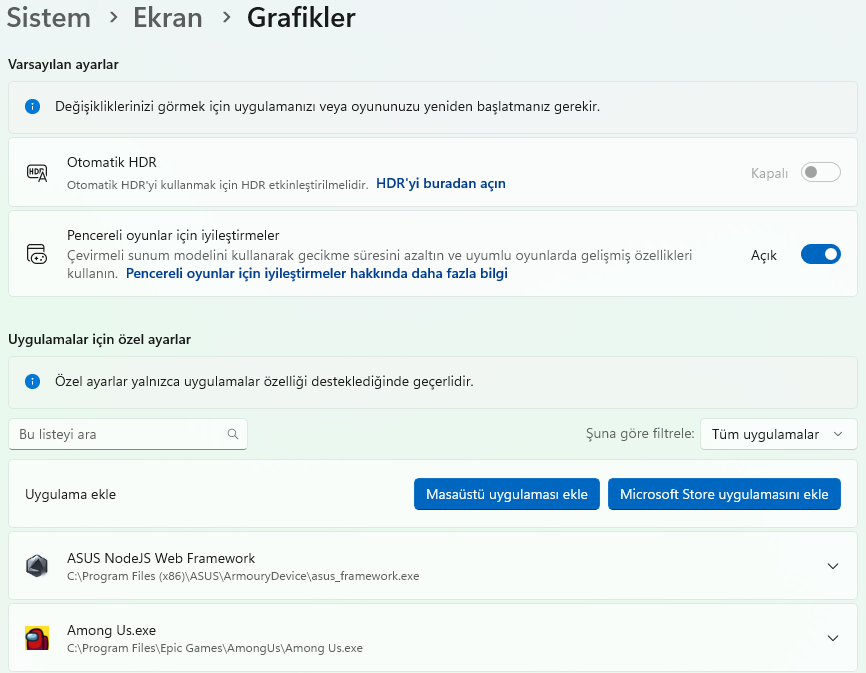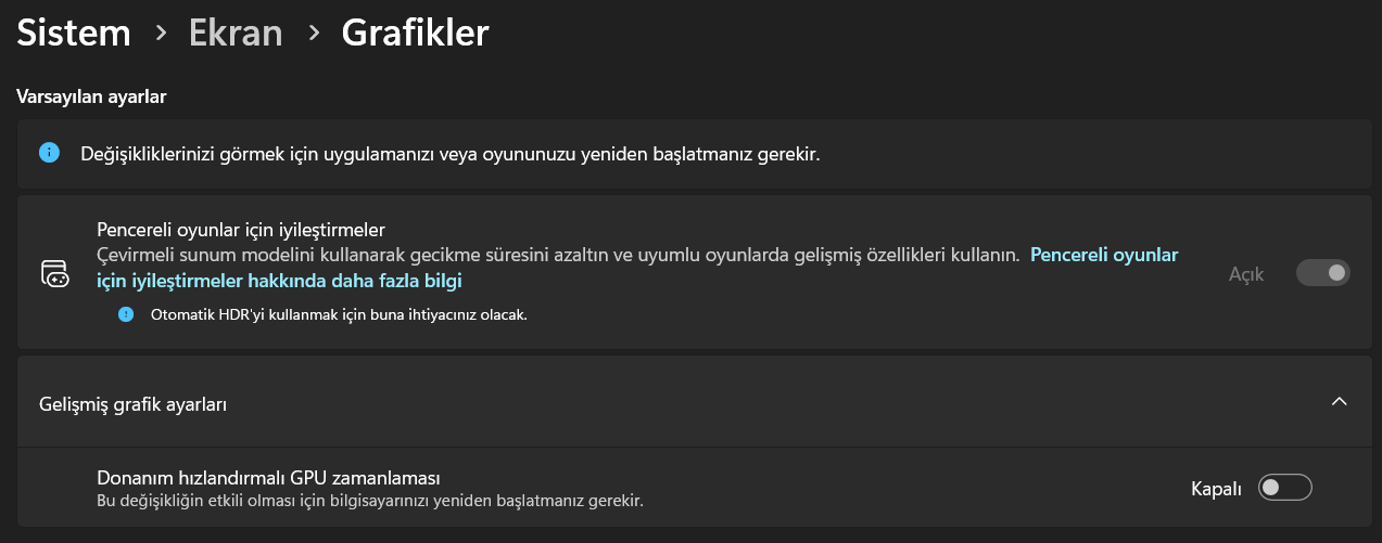 Ayarlardan Ekran ayarlarına girin. Ondan sonra Grafik ayarlarındaki Gelişmiş ekran ayalarındaki “Donanım hızlandırmalı GPU zamanlaması” ayarını kapatıp PC'yi yeniden başlatıp tekrar deneyin hocam.Merhaba FM gibi oyunlar oynarken oyun içinde bir kasma yok fakat Windows ve mouse imleci deli gibi kasıyor. Neden olabilir?