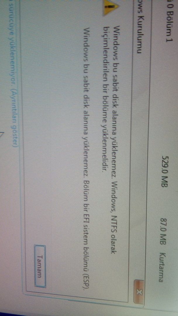 "Windows, NTFS olarak biçimlendirilen bir bölüme yüklenmelidir" uyarısı