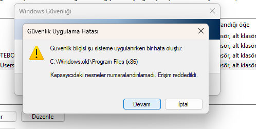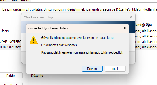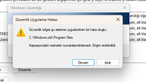 2 gün öncesine kadar hep Windows 10 kullandım fakat 2 gün önce Windows tool ile hiçbir veri kaybı olmadan Windows 11'e geçtim fakat 30GB yer kaplayan windows.old klasörünü silmek istediğimde hata alıyorum. Administrator size izin vermelidir diye, fakat kendi kullanıcıma silme iznini vermeme rağmen silemiyorum. WinDirStat denedim gene silemiyorum. Attığım fotoğraflarda kendime izin vermeyeğe çalıştığım zaman ekteki hataları alıyorum.