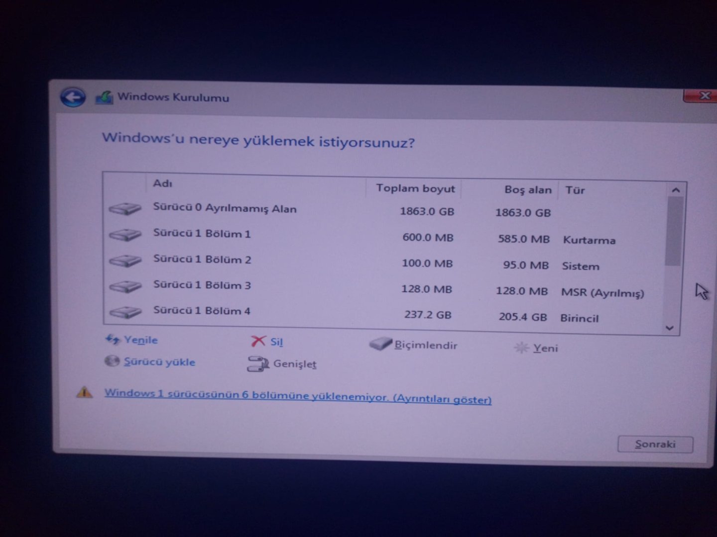 2 TB HDD'ye ve 250GB SSD'ye sahibim. Bilgisyarımda SSD gozukmuyordu ve SSD ile alakali hatalar aliyordum. Windows'a format atarken soyle bir goruntu ile karsilasiyorum;