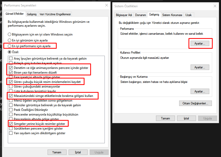 Daha sonrasında Performans kısmının ayarlarını açın. Görsellerde gösterdiğim gibi öncelikle ''En iyi performans için ayarlar'' yapın ve gösterdiğim ayarları açın. Uygula ve tamam diyerek kapatın.