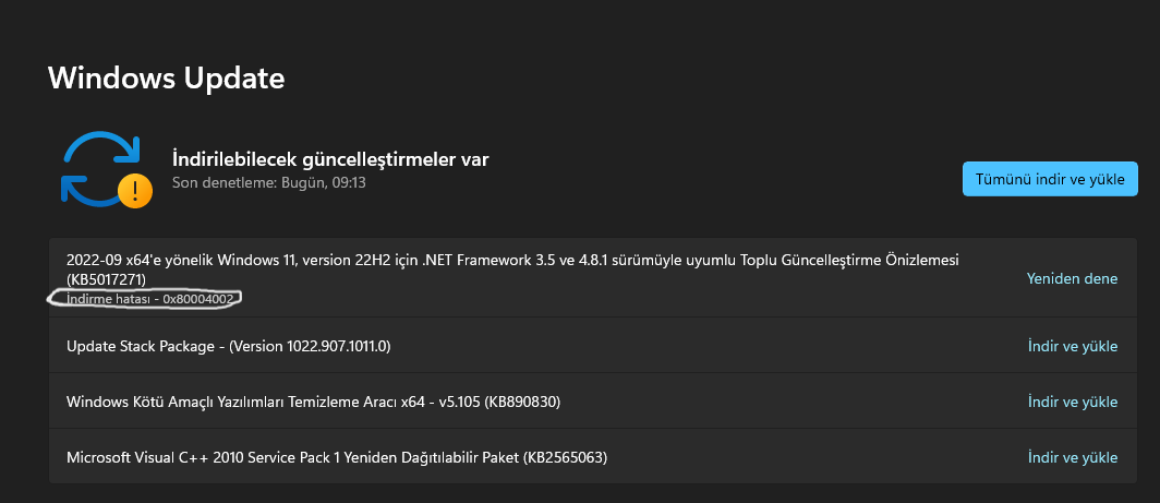 İndir ve yükle dedikten sonra %0 da kalıyor ayarları kapatıp açtıktan sonra bu hatayı veriyor bunun sebebi nedir? Çözümü nedir?