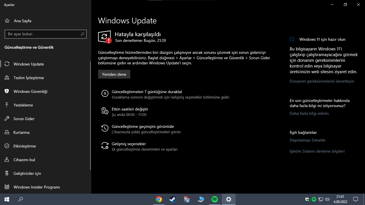 Windows Update'e tekrar girip, güncelleştirmeleri duraklat deyin. Daha sonra duraklatmayı kaldırın. Tuhaf bir çözüm seçeneği gibi gözükebilir ancak işe yarayabilir.