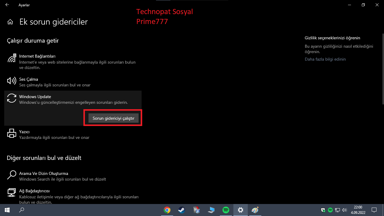 Windows'un arama yerine sorun gider yazarak girin ve ek sorun gidericiler'e tıklayın, Windows Update seçin ve "sorun gidericiyi çalıştır" tıklayın.