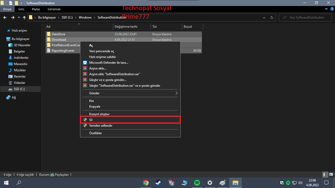 SoftwareDistribution klasörünün içerisindeki temizleyelim.