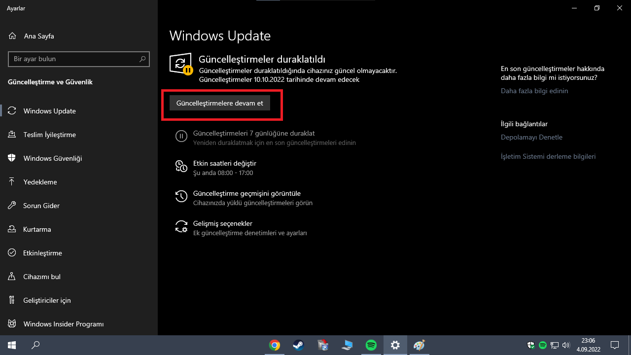 Windows Update'e tekrar girip, güncelleştirmeleri duraklat deyin. Daha sonra duraklatmayı kaldırın. Tuhaf bir çözüm seçeneği gibi gözükebilir ancak işe yarayabilir.