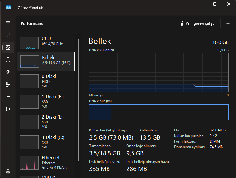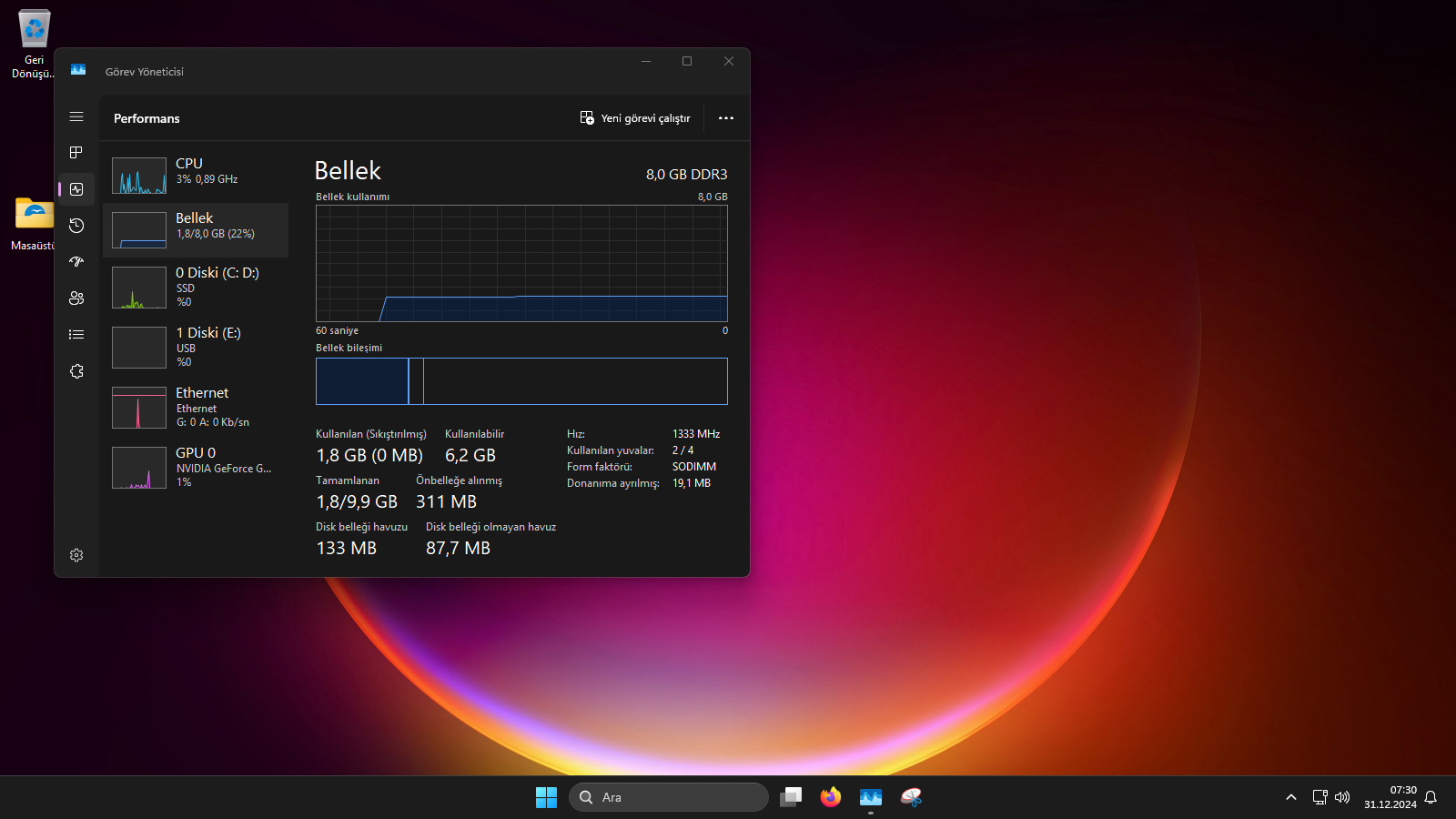 RAM kullanımıyla ilgili de kendi bilgisayarımdaki sonuçları bırakıyorum boştayken sonuçlarım şu şekilde,