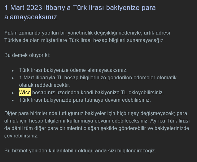3 hafta oluyordur net hatırlamıyorum ama Wise artık TL kurunda destek vermeyecek ama yine de farklı dovizlerde kullanabilirsiniz tarzında mail gelmişti.