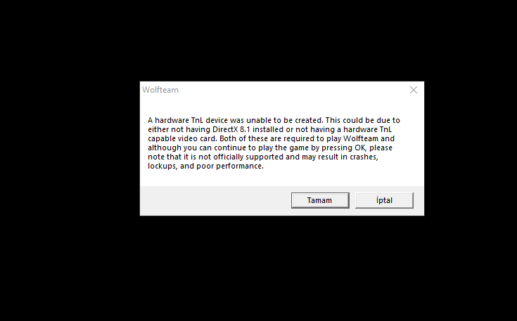 Bugün eskileri anmak amaçlı Wolfteam indirdim ancak böyle bir hata ile karşılaştım. Nasıl çözebilirim? İnternette ve diğer forumlarda net bir çözüme ulaşamadım. Hataya neden olur mu bilmiyorum ancak bu bilgisayarımda DirectX 12 var.