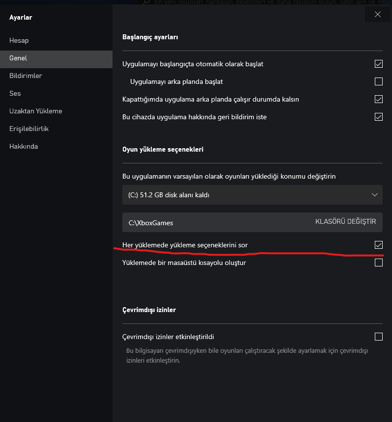 "Genel ayarlar > gidin. 3. "Bu uygulamanın varsayılan olarak oyunları yüklediği yeri değiştirin" i bulun ve sadece tercih ettiğinizi seçin"