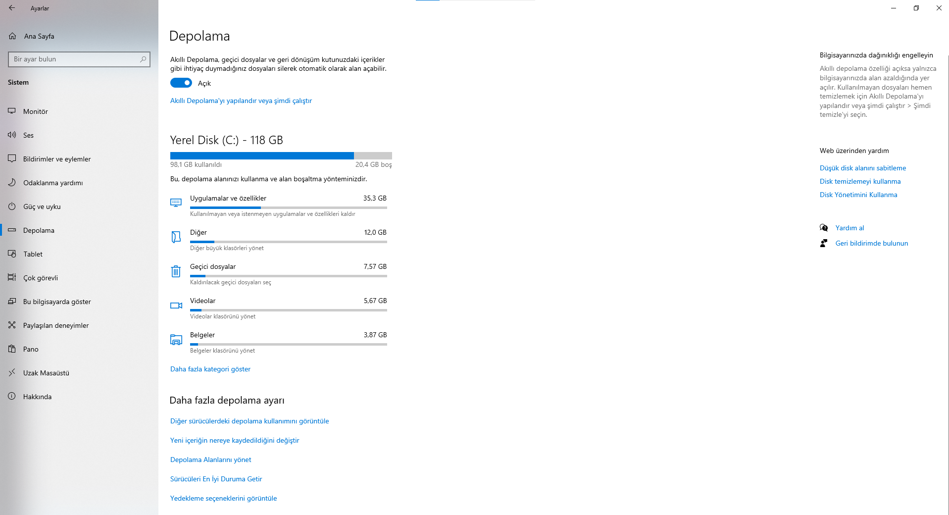 Başlat çubuğuna depolama ayarları yazıp gelen bölümden uygulamalara giriyoruz.