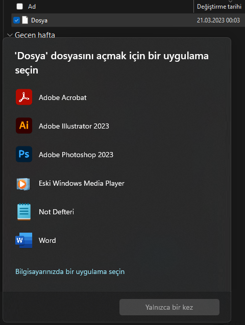Windows bu tepkiyi dosyanın bir uzantısı mevcut değilse yapar genellikle.3. uygulamayı deniyorum, başka bir uygulama seç diyorum ama exceli seçince altta "yalnızca bir kez" butonu yanıyor.