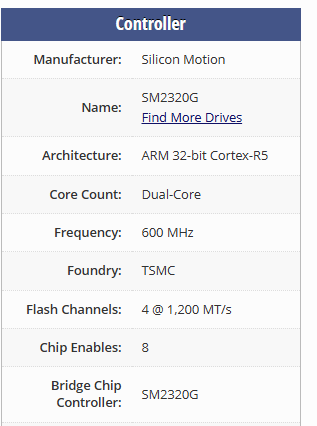 SM2320G hakkında bilgi yok. Düz 2320 ise 4 Flash Channel'lı ve 2GB/s maks hızları olan TLC/QLC destekli bir kontrolcü. "Taşınabilir" depolamalar için özel üretim.