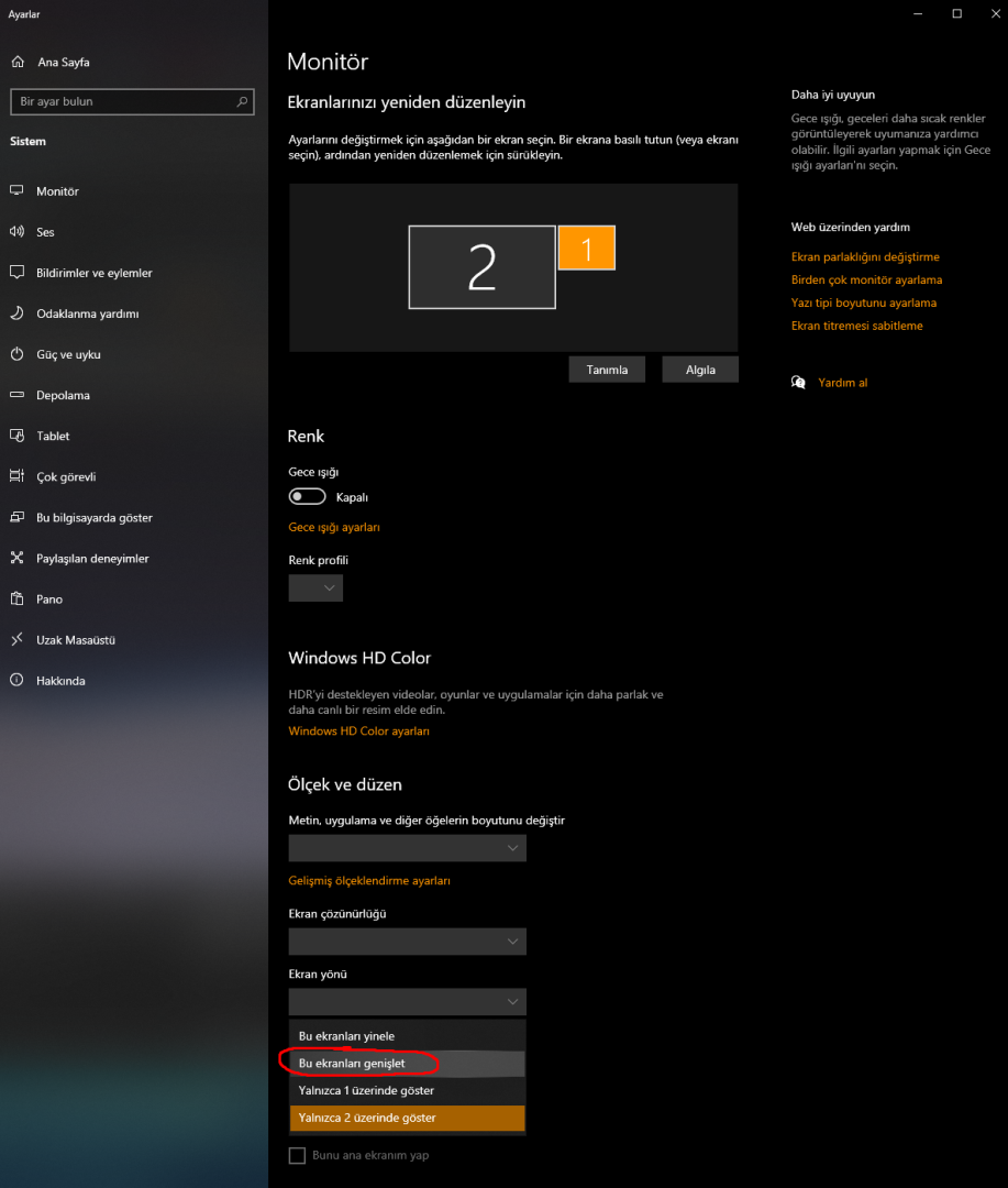 KafadanKontak dedi: Birden Çok Ekran menüsü var bak orada. Gözünden kaçmış olmalı Büyük ihtimalle onun içerisinde. Çözüldüyse bir ÇÖZÜM alırım Genişletmek için tıkla... yanlız monitörü algılamıyor.