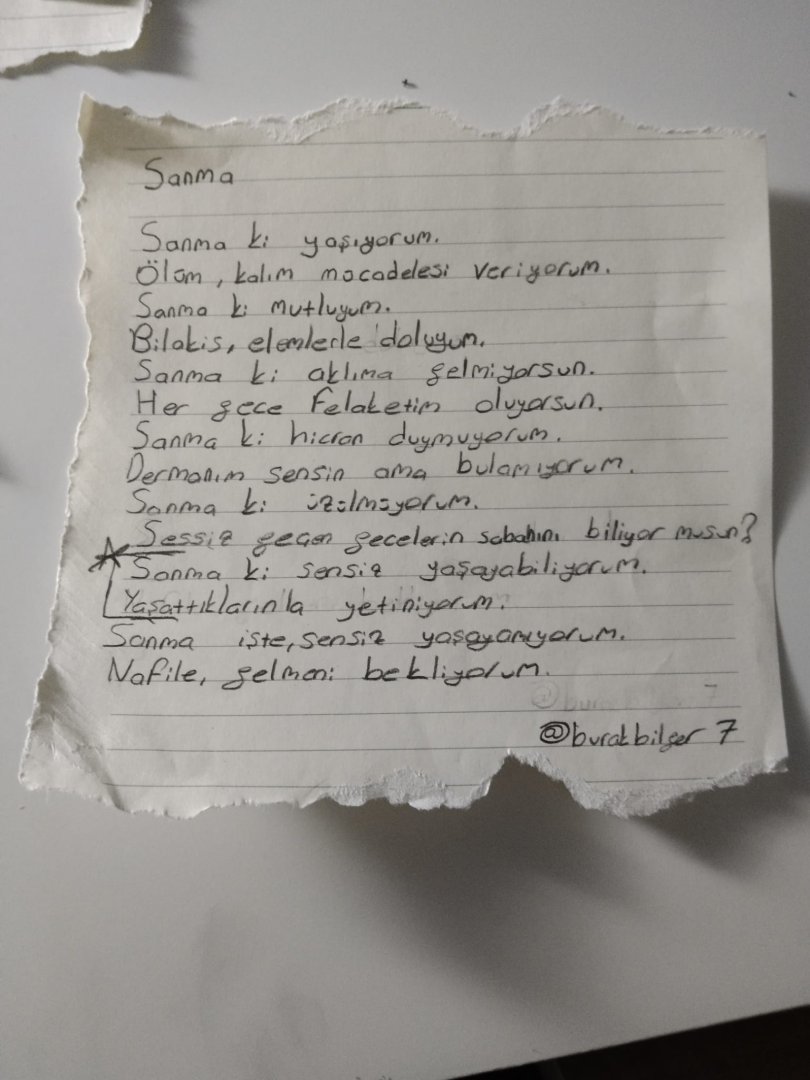12 sınıflar arası şiir yarışması düzenleniyor ve ben de bu yarışmaya katıldım, bu yarışmaya size fotoğraf olarak gösterdiğim ""sanma ki" şiiri ile katıldım ve kendim yazdım. Şiirde yıldızladığım yer çok hoşuma gitti diye yıldızladım, ekstra bir söz olabilir, bu sözü nasıl ben yazdım diye de düşünmedim değil. Şiirimi nasıl buluyorsunuz? Yorumlarınızı merak ettim.
