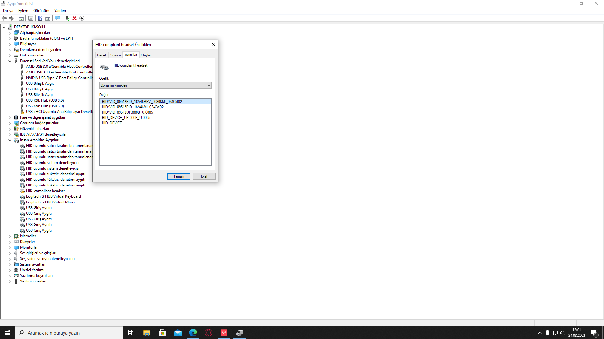 Ünlem işareti olan sürücüye sağ tık, özellikler, ayrıntılar, donanım kimliklerini buraya atar mısınız?
