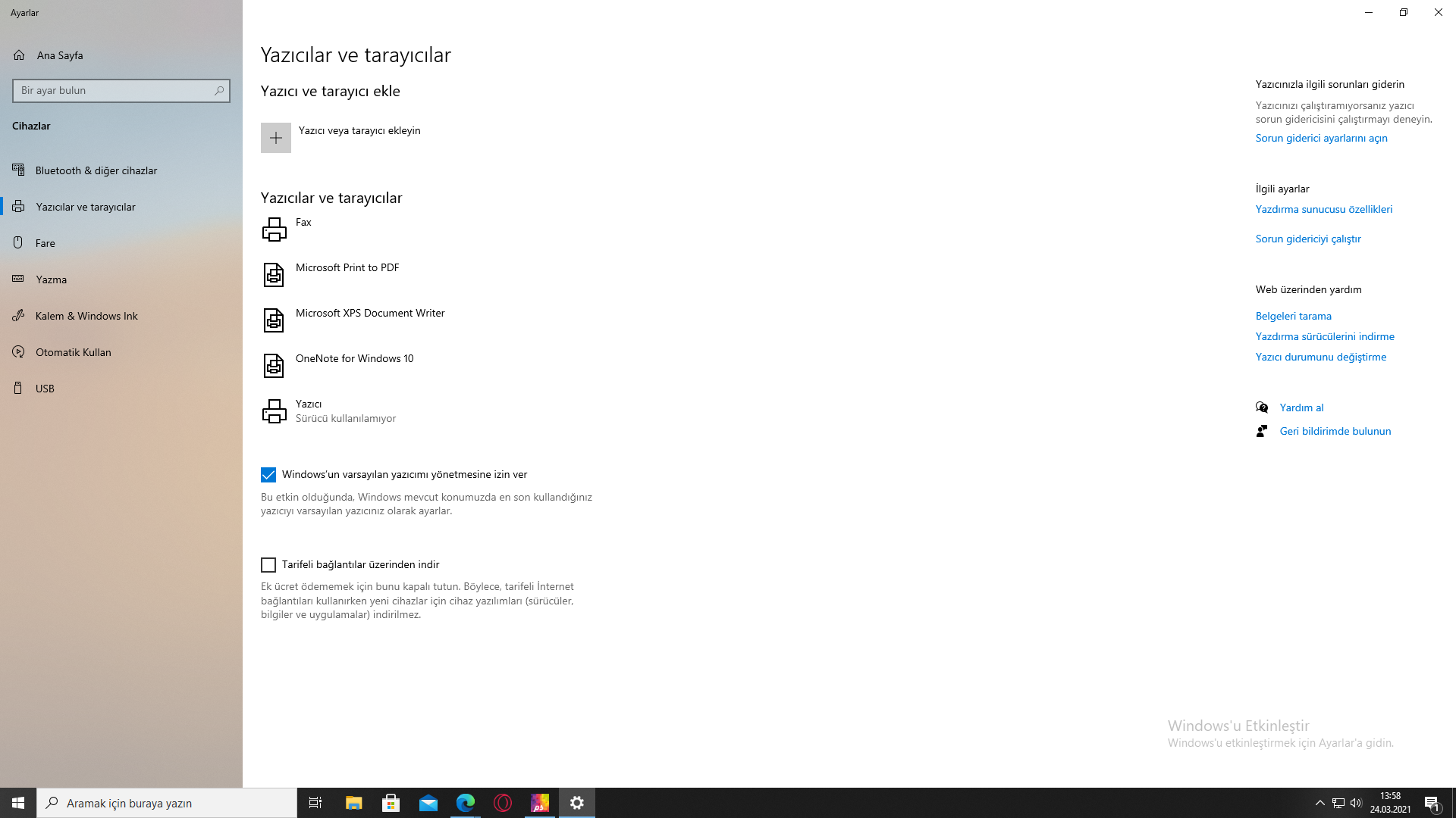 Yazıcı takılıyken, aygıt yöneticisinden sol üstten Eylem - donanım değişikliklerini tara yapıp, sarı ünlem işareti olanları ve "Yazdırma cihazları (ya da kuyrukları)" bölümünün fotoğrafını atar mısın?