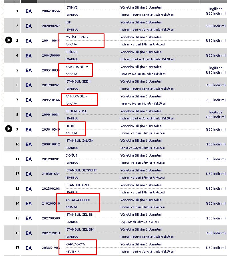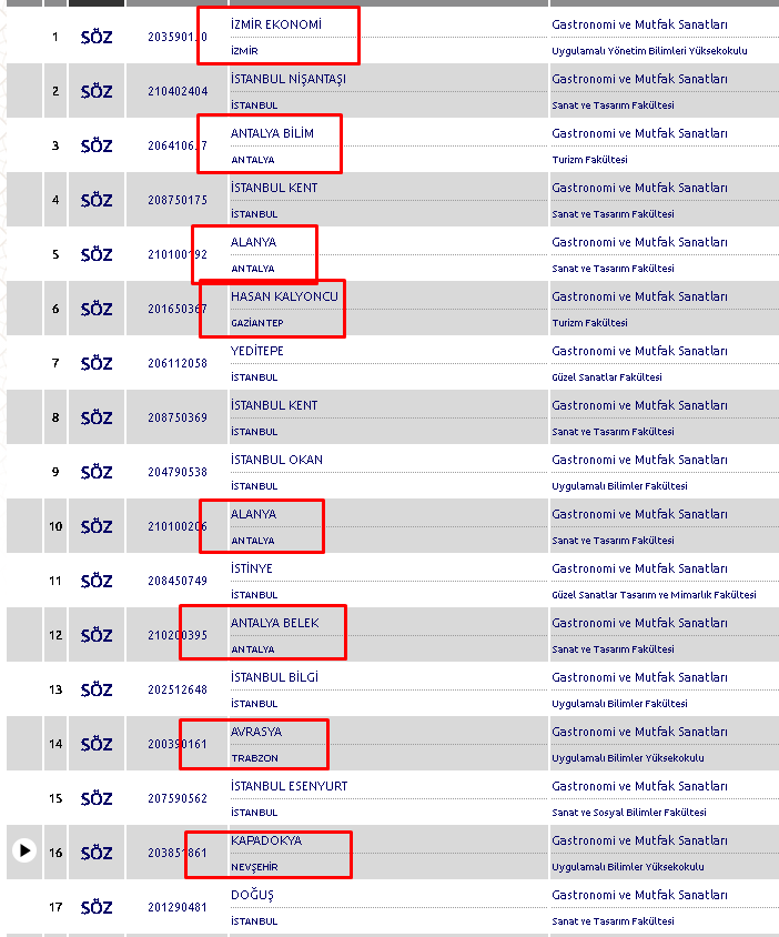 Kırmızı şekil içine aldıklarım İstanbul'da olmayanlar İstanbul'da okumak istemiyorum. Bu arada sıralamam Sözelde 200K EA da 460K Sayısalda 340K aklımda sadece bu bölümler var bölüm tavsiyesi vermek isterseniz açığım her şeye. Ama bunlar arasında sizce hangi üniversiteye gitmem mantıklı olur? İlk aklımda Yaşar Üniversitesi gastronomi vardı ama %50 burslusu 2024 de kapatılmış. O yüzden şu an aklımda İzmir Ekonomi Gastronomi var. YBS de güzel üniversite bulamadım okunacak bu puanda. Sayısalda zaten hiçbir şey yok direk. Yardımınız için teşekkürler.