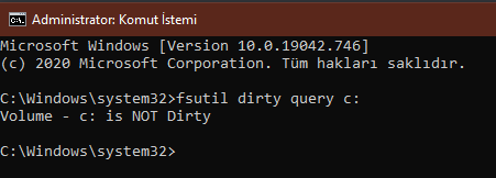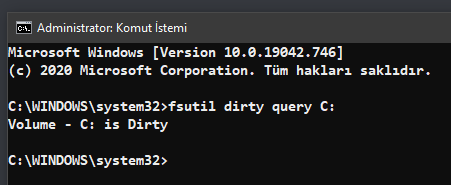 fsutil dirty query c: yazdım. Bu kod diskin bozuk olup olmamasını gösteriyordu. Çıkan sonuç:Evet, disk bozuk görünüyor, korkmadım değil.