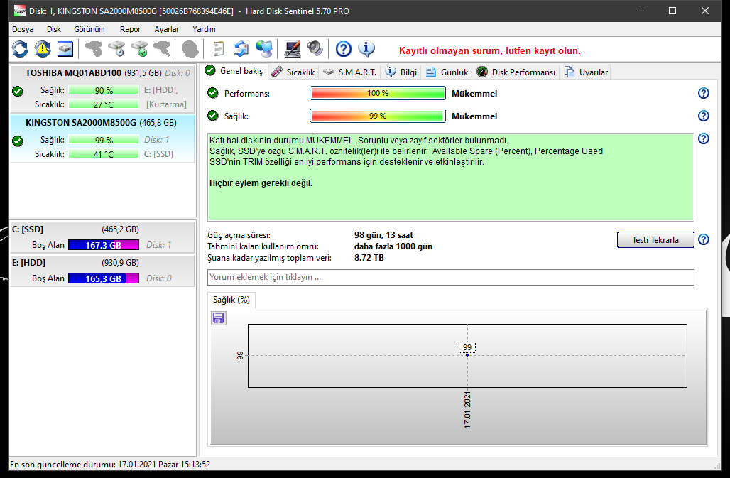 Sağlık durumu: (Kingston olan SSD, Toshiba HDD. Kingston'a bakın.)
