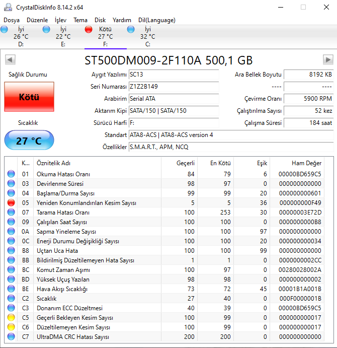 Yeni hard disk CrystalDiskInfo'da kötü olarak gözüküyor
