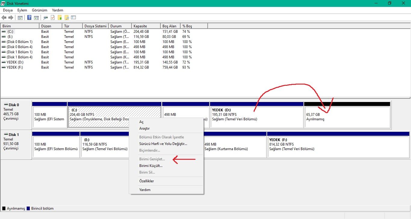 SSD'de ki D'yi küçültüp SSD'de ki C'yi genişleteceğim. Fakat C'de genişlet seçeneği çıkmıyor. Bu seçeneği nasıl açabilirim? Siz yapıp yapamamanız umrumda değil, nasıl yaptığınız umrumda.