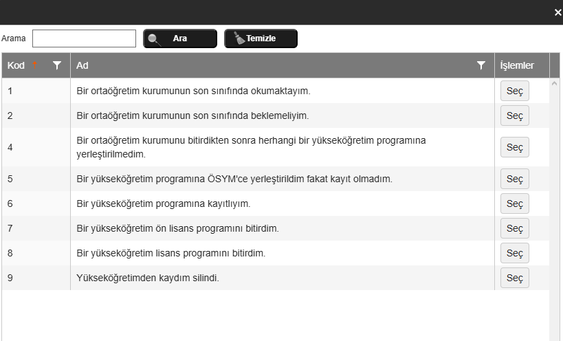 Anladığım kadarı ile Üniversiteye kayıt yaptırmadın, en son lisede okudun şuan 3. mezun senen. 4. seçeneği seçmelisin. Üniversite kazandın ama kayıt yaptırmadıysan 5.