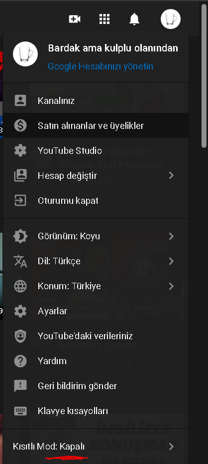 (Profile tıklayıp aşağı scroll yaparsınız en aşağıda kısıtlı mod var bilgilendirme için