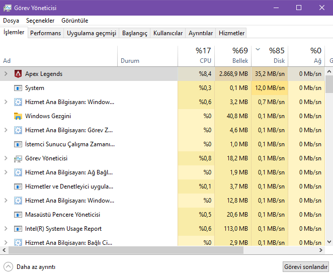 Apex Legends oynarken disk kullanımı çok fazla oluyor %85 ve üzeri. Bu da oyundayken FPS'in anlık olarak 20-30a düşmesine sebep oluyor. Yani FPS düşmesi oluyor. Her 3-4 dakikada bir 5-6 saniye boyunca FPS'im 20 civarı oluyor. Türkçe ve yabancı kaynaklardan çoğu çözüm önerisini denedim ama sorunum devam ediyor. Bu sorunu yaklaşık 2-3 aydır yaşamaktayım. İşin garip kısmı ise bazen oluyor bazen olmuyor. Örneğin 10 gün önce yaşıyordum ama 3-4 gün sonra kendiliğinden düzeldi FPS düşmesi yememeye başladım(2 gün boyunca).dünden önceki güne kadar bir sıkıntı yoktu, düzeldi sandım kendiliğinden. Ama dünden beri sorunu yine yaşamaya devam ediyorum. Yardımlarınızı bekliyorum.