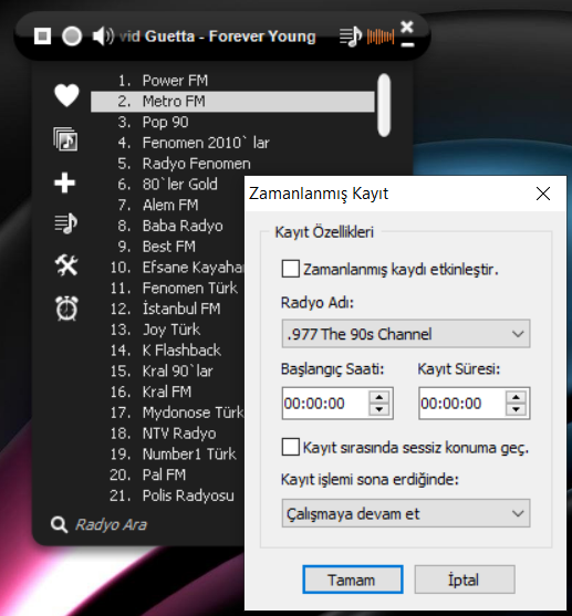 Bugün bir radyo programında bir parçayı tekrar dinlemek istedim (canlı yayın icrasıydı YouTube'da bulamam. Programın kaydı da yok. Bu gece 01:00 da tekrarı varmış. O saate kadar da durmak istemiyorum. Zamanlayıcılı bir radyo kayıt yazılımı ya da eski programları dinleme platformu var mıdır?