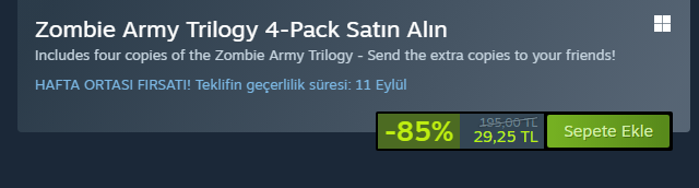 Sniper Elite serisine bağlı ama sanırım daha sonra kendisi bir seri haline gelen zombie army serisinin ilk 2 oyununun cilalanmış halini ve 3. oyununu barındıran ürün sadece 10 TL. Sniper Elite serisini sevenlerin şans verebileceği bir oyun diye düşünüyorum.