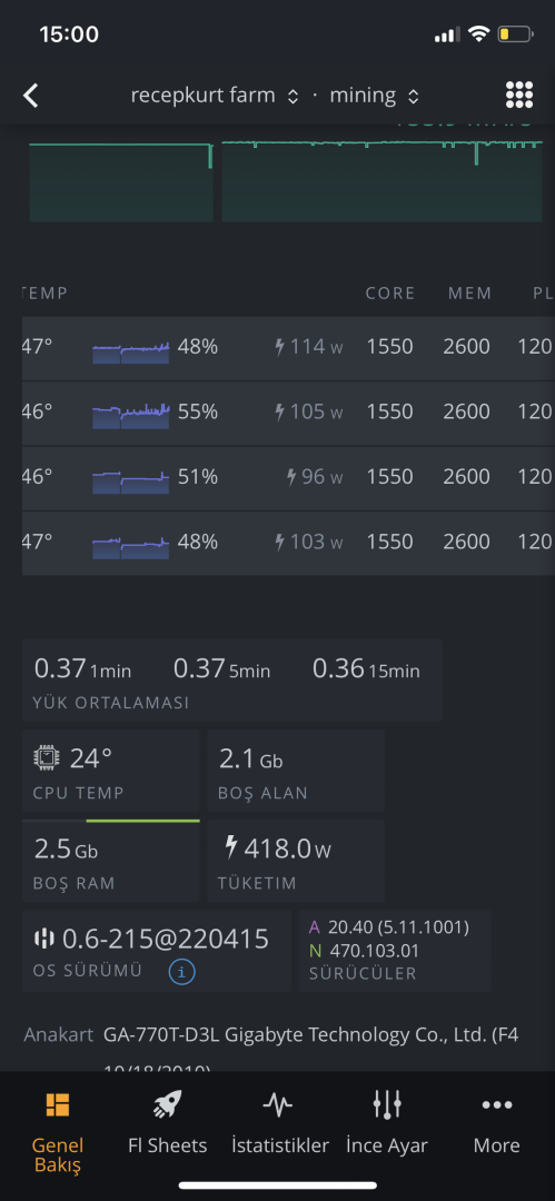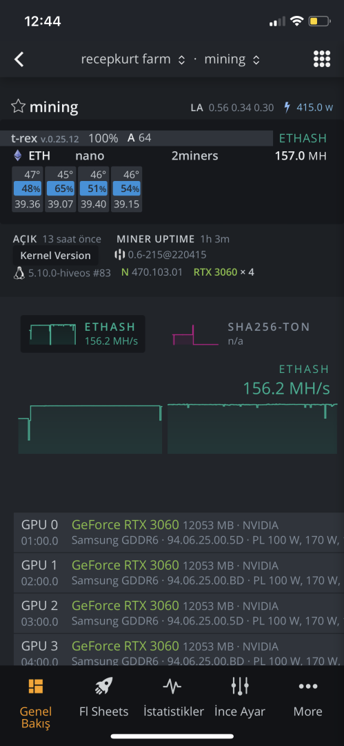 Hocam ayarları da paylaşırsanız daha iyi olur.Bendede 3060 v2 var 4 kartla max 415 watt çekiyor sıcaklıklar tüketim ve aldığım mhları paylaşıyorum trex lhr kilidini % 79,5 kadar kırdı tek kartla 39,5 a kadar mh alabiliyorum resme bakabilirsiniz