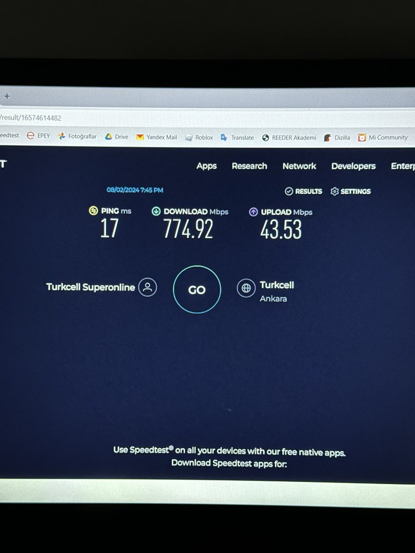 - ASUS TUF FX-505du bilgisayarımda 15m CAT6 urgen kablolu test ile 774 Mbps download ve 43 Mbps upload verdi.