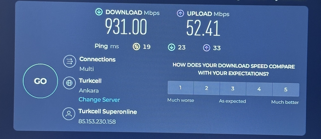 Anlaşma bittikten sonra 1.000 Mbps'lik pakete geçiş yaptım. Modem değişimi yapılmadı, yalnızca yanına TV+ kutusu verdiler. Hız testi sonuçlarım ise şöyle: