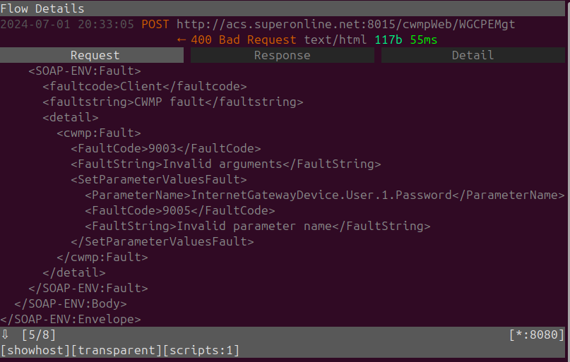 mitmproxy de 400 bad request değil de oradaki başarılı isteklerin içine girip rasgele bir kod örneği almanız gerekiyor örnek vermek gerekirse şöyle başarılı bir isteğin içine girin ve (zte den örnek veriyorum farklı olabilir) "<Name>InternetGatewayDevice.DeviceSummary</Name>"