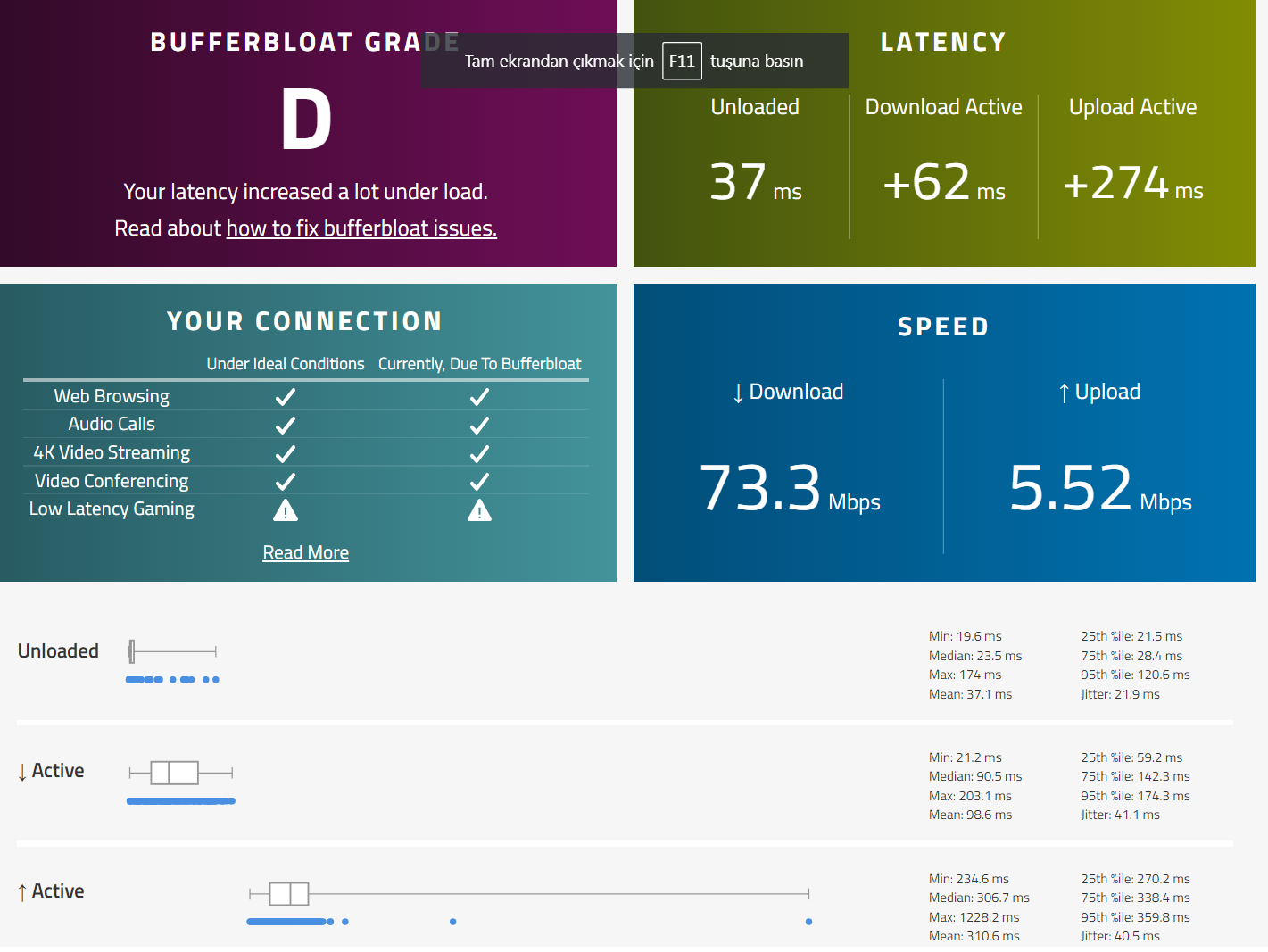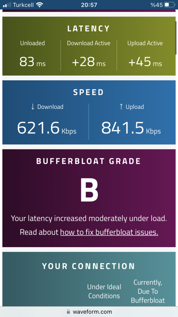Ayarları uyguladıktan sonra bufferbloat testi yapabilirsiniz: